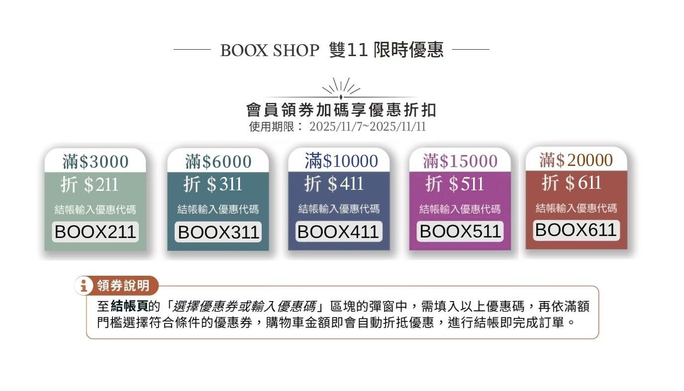 單筆結算金額滿3千/6千/1萬/1萬5/2萬元,相對折抵211/311/411/511/611元(結帳時須輸入折扣代碼)。
