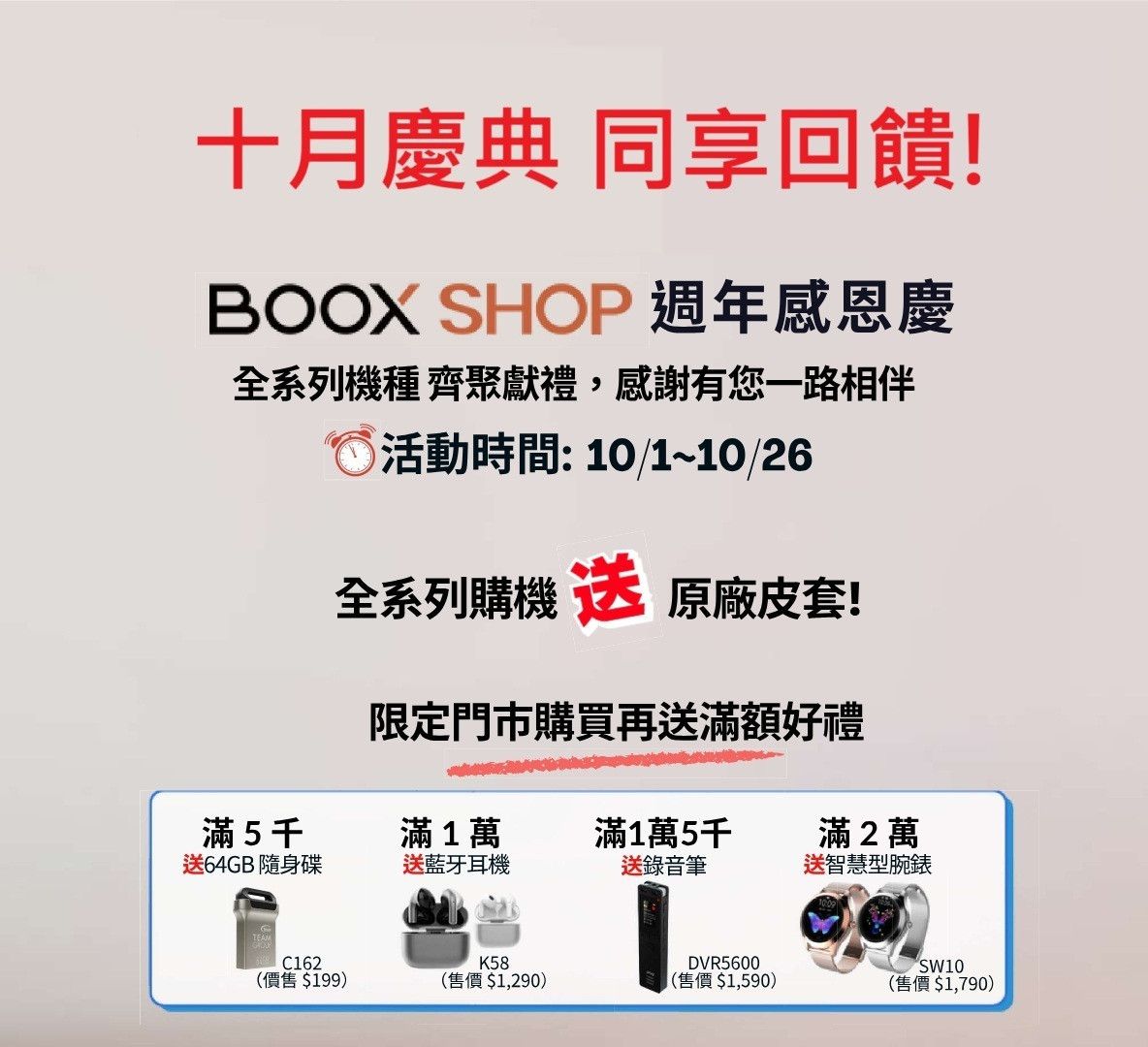 凡活動期間購買閱讀器免費贈「原廠皮套」,10/15起全館再加碼「滿額折扣碼」。親臨門市購買還有「滿額禮」讓您現在就能省的多拿更多。