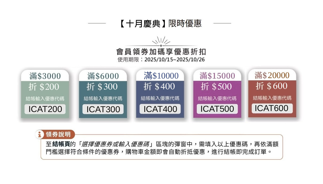 單筆結算金額滿3千/6千/1萬/1萬5/2萬元,相對折抵200/300/400/500/600元(結帳時須輸入折扣代碼)。