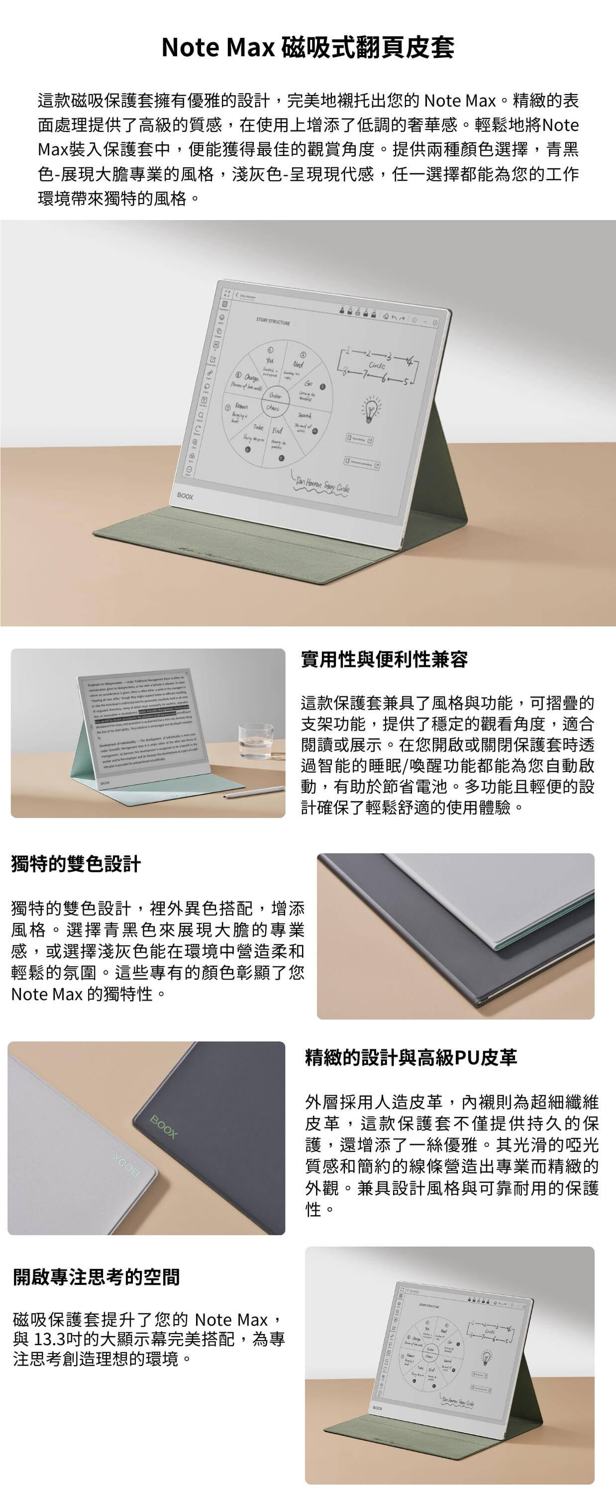 商品詳情 規格與說明: 13.3吋專為BOOX Note Max 設計的磁吸翻頁皮套,優雅的設計外觀與多功能兼具, 可作為摺疊支架使用,高級PU人工皮革與製超細纖維內襯製成,支援自動睡眠/喚醒功能。 ●Note Max 專用磁吸式翻頁皮套 ●自動睡眠/喚醒功能●可作為折疊支架使用●上乘材質,自然舒適,全面保護 【商品規格】 外觀尺寸:288x247x2 mm 重量:約285g 13.3吋BOOX磁吸式皮套(限Note Max可用)- 青黑/灰白色 TWD $1,480 TWD $1,480