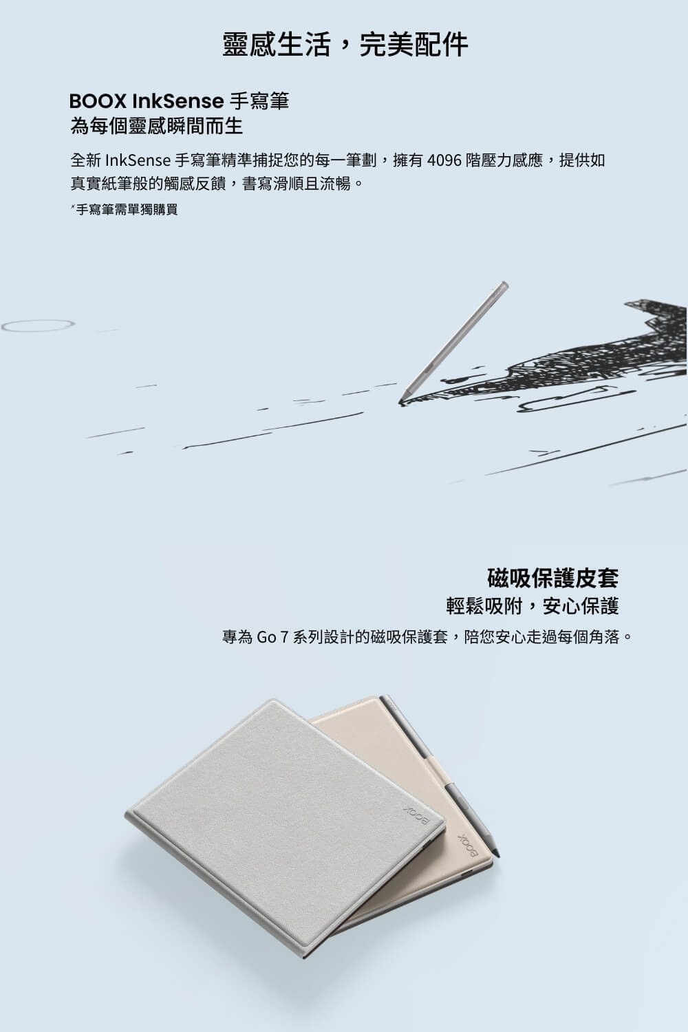 組合品:磁吸式皮套、BOOX InkSense 手寫筆 (需另選購組合商品)、類紙膜一張 (隨加購手寫筆出貨)