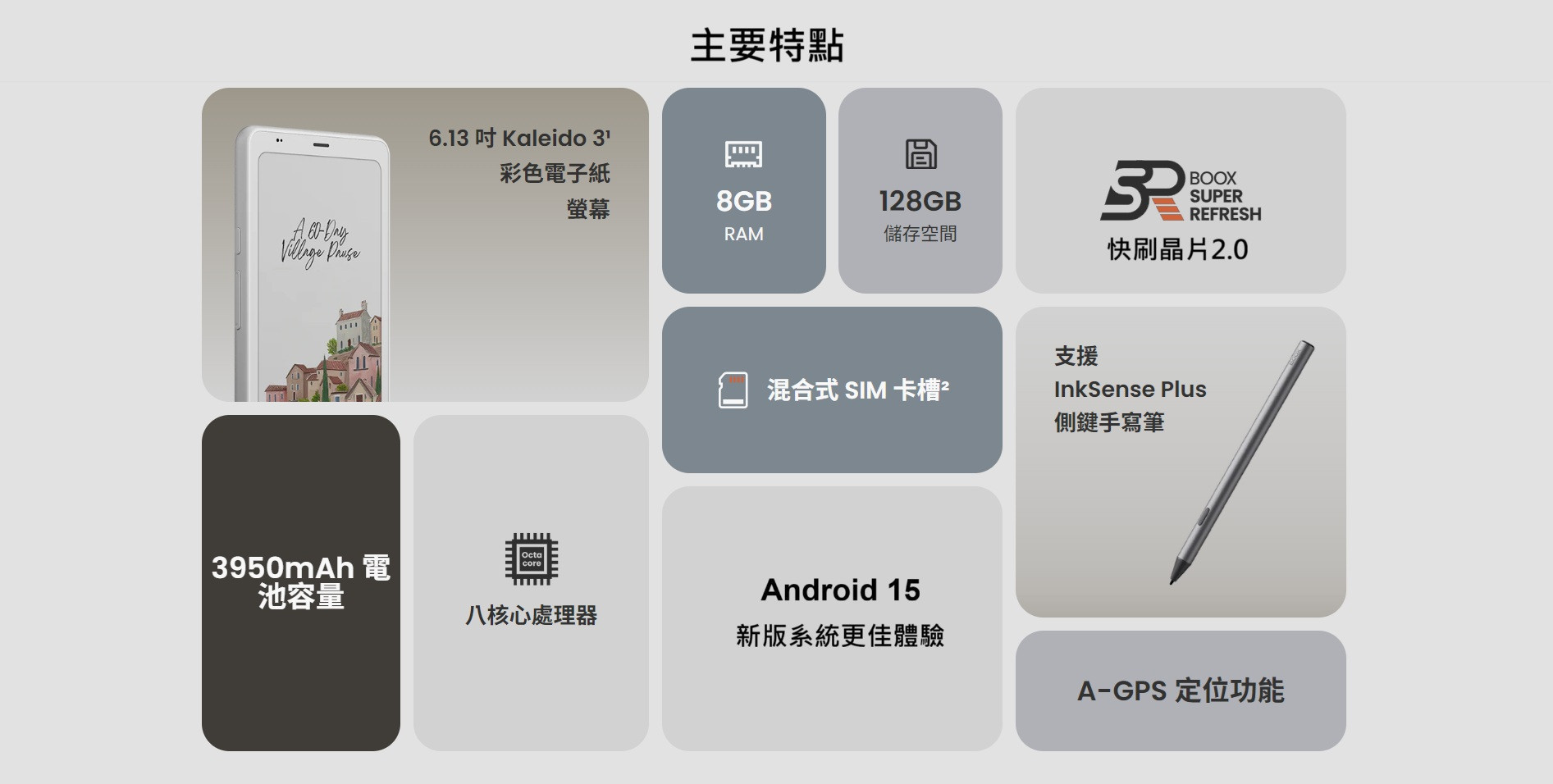 - 6.13吋4096色Kaleido 3電子墨水E-ink顯示幕